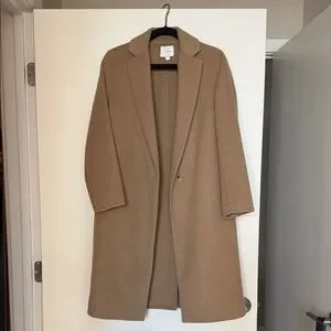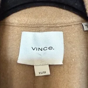Elegant Vince blanket coat in a classic tan color. Features a single-button closure. Perfect for layering.