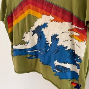 Super Rare Aviator Nation Olive Green Tee with Vibrant Wave Graphic SM