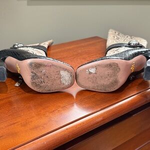 Elevate your style with these chic Prada knee-high boots featuring a striking snakeskin pattern. The black accents add a touch of elegance, making them perfect for any occasion. Silver buckle/button on the side of each boot. Inner calf zip-up. Heel height is 100 mm (about 4 inches). Size 36 1/2 EU (6.5 US). Only worn a few times, in mint condition. Original box and dust bag included