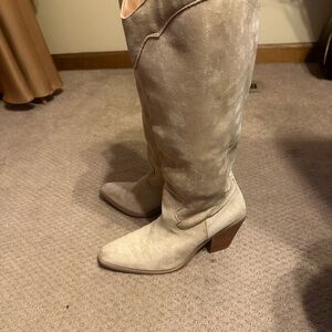Elevate your look with these stylish cream heeled boots. Perfect for any occasion. Worn once for pictures. Fully suede with leather inside