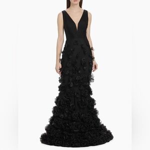 This Marchesa Notte dress showcases a sense of refined elegance with its sleeveless V-neck design and mermaid gown silhouette, further enhanced by the addition of three-dimensional rosette appliqués.