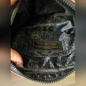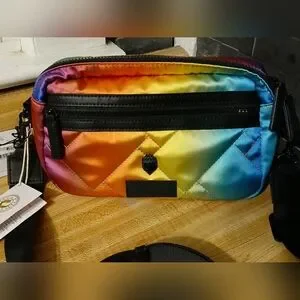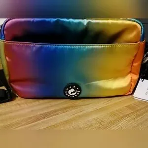 Vibrant rainbow design. Quilted texture. Black adjustable strap. Front zipper pocket.