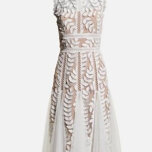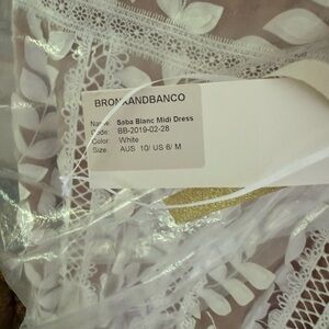 Chic, feminine midi dress by Bronx & Banco, “Saba Blanc,” in pristine condition (new with tags). Ivory white applique lace gives this dress a romantic, elegant vibe that is perfect for bridal showers, summer parties, garden weddings, or special occasions. Lightweight, airy fabric drapes beautifully and flatters the silhouette.