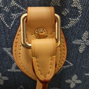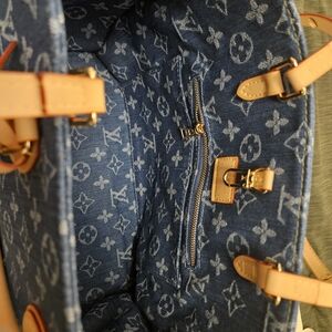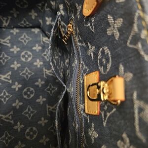 Elevate your style with the Blue Monogram Denim Tote in MM size. This bag features a classic monogram design on durable denim, complemented by tan leather handles.