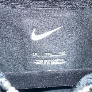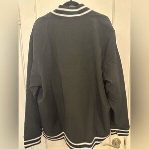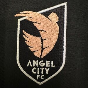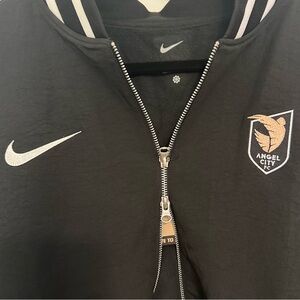 Angel City FC Nike bomber jacket in black, 2XL. Features white accents and logo detailing. Stylish and versatile. Jacket is fleece lined for warmth, two inside pockets, double front zipper, two side zippers for expansion/cooling, and two front zippered hand pockets.