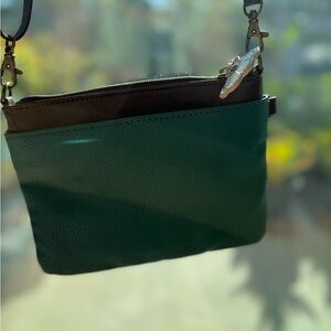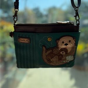 Stylish turquoise crossbody bag featuring a cute Otter & Baby design. Perfect for casual outings. The inside is brown with green dots used in great shape. Comes with 2 handles. 1 is for over the shoulder and the 2nd is for like wrist. The handles are in side bag for storage.