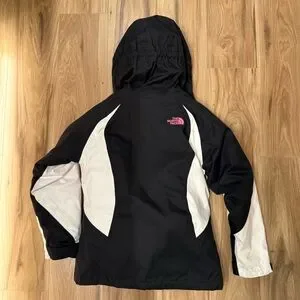 Girls Black and white waterproof jacket with pink details, size 7/8. Two jacket-in-1. Removable pink shell jacket. Sleeves have Velcro to tighten around gloves or keep snow out. Has toggles at the bottom hem to tighten and keep the draft out. Also included is a pair of Kids blue Northface gloves. Size Medium. Only worn a couple of times for a weekend mountain snow trip.