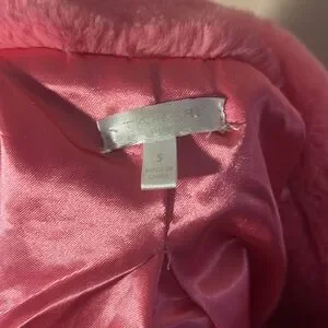 It’s a non traditional holiday color- a gorgeous hot pink- with a luxurious looking faux fur collar. It’s a Tahari. I got it at TJ Maxx or Marshalls. It was obviously a factory second from the start because it’s a snap front closure and they’ve all pulled out. It could be worn open, or taken to a tailor for repair. Priced accordingly.