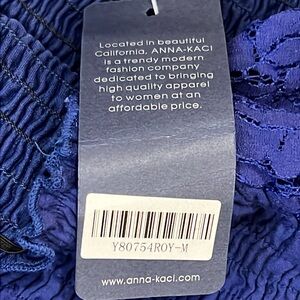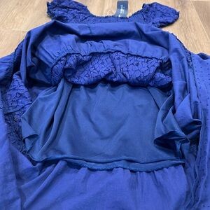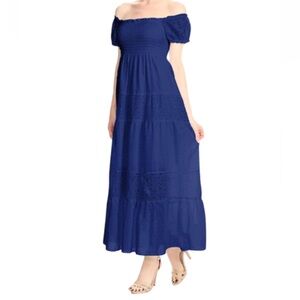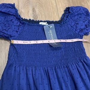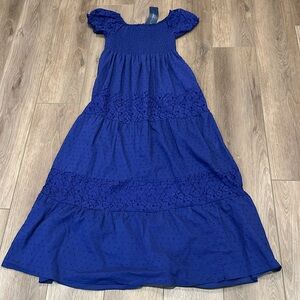 Summer Boho Peasant Ruffle Stretchy Smocked and Lace Long Beach Maxi Dress in NWT condition. Smocked bust with elastic stretch at top of dress to allow for off shoulder style. Elastic bands also around sleeve cuffs. Lace style on sleeves and tiered sections of dress. Lined to just below first lace section below hips. Swiss dot design on alternating tiers of dress. Flowy, beach style. Approximate measurements: length 49”, 12” armpit to armpit laying flat (can easily stretch to 18-19” + with smocked fabric), waist 13” laying flat (can easily stretch more), hips 22” laying flat (very flowy feel). Color is navy blue and size listed is medium.