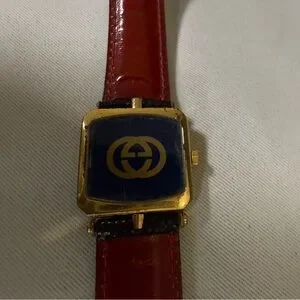 Authentic Gucci 3000M vintage quartz watch with the rare red + navy stripe dial. Includes two leather straps (black embossed + red leather), both with Gucci-logo buckles. Comes with Certificate of Authenticity.