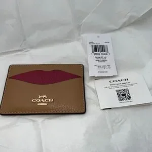 Keywords: Coach card holder, designer wallet, lips print, pebbled leather, minimalist wallet, slim card case, fashion accessory, everyday carry, gift for her, statement piece, luxury accessory