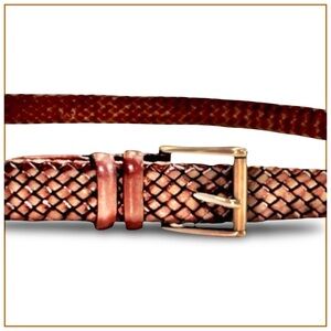 Hand-woven calfskin belt, an icon of design excellence, featuring a buckle with a bronze finish and a tubular design.