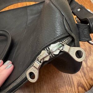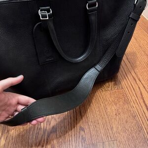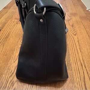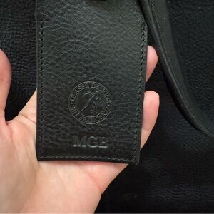 This is a large capacity heavy duty black leather tote perfect for travel. It’s been used and has some scratches, but it’s still in very good condition. This bag will outlive us all. The tag is embossed with MGB.