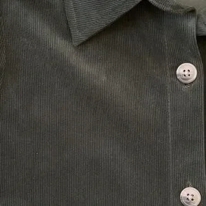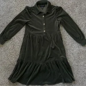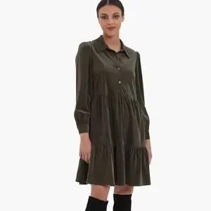 Chic dark green dress with long sleeves. Features a tiered design and button-up front.