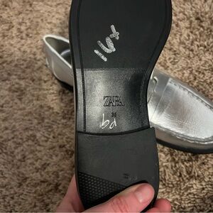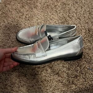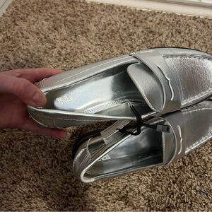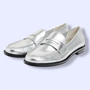 Shiny silver loafers with a sleek design. Ideal for stylish comfort.