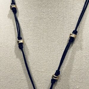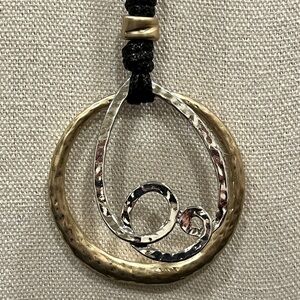 This stunning necklace features a unique black cord with a striking hammered gold and silver pendant. Perfect for adding a touch of elegance to any outfit.