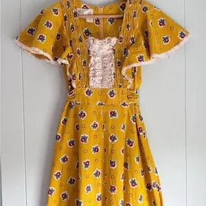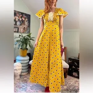Dreamy 70s vintage cotton maxi sundress in the happiest mustard yellow with small red, blue white and black floral print. Center back zip, ruffled yoke and flutter sleeves. Ties at back waist. Reminds me of Candi Jones and Gunne Sax. Such a sweet, happy dress☀️