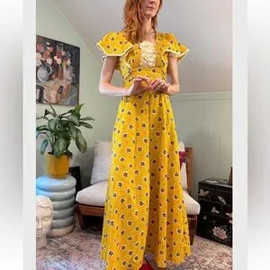 Vintage 70s Floral Yellow Maxi Dress