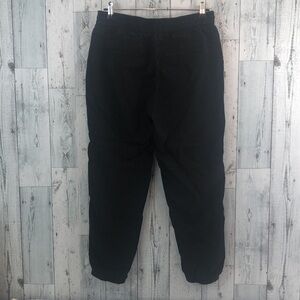 Black with black and white ribbon drawstring and down legs, elastic waistband, elastic hem, 4 pockets, soft,colors may vary due to lighting, good used condition, Sz: S