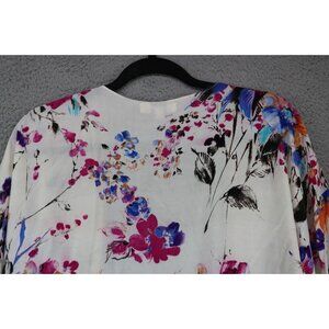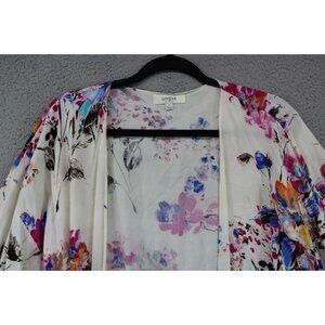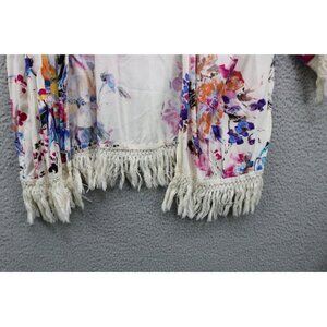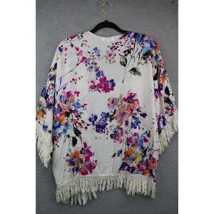 Umgee Floral Overlay Open Front-Size Small-Fringed-BOHO-Oversized. Item is in Excellent Condition. The material is 60% Cotton and 40% Polyester. Laying flat measuring armpit to armpit it is 26'' and 28'' in length.