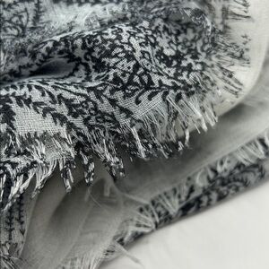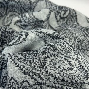 Chic scarf with a black paisley pattern on a gray background. Perfect for adding a touch of elegance to any outfit.