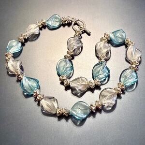 This is an exquisite light blue and white twisted artisan glass beaded link necklace measuring 19" in length. It's in NWOT condition.