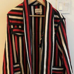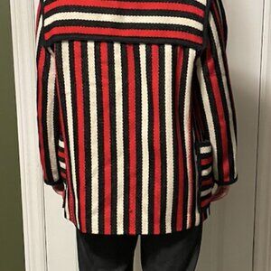 Red, black & white striped wool blanket jacket with shawl neck. Fits M/L, ends at fingertips. Deep front pockets, and additional breast pockets as well. No closure on the front. Small snag on back near the bottom (photo shown), but otherwise great condition. Fits oversize on 5' 4" size 6 (as shown in photos on).