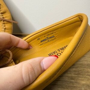 Stylish Minnetonka moccasins in mustard yellow. Soft leather material. Comfortable fit.