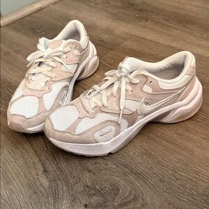 Elevate your look with these stylish Nike sneakers. Perfect blend of mauve and white. Ideal for everyday wear.