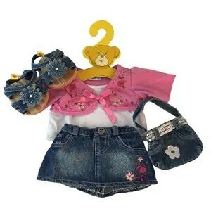 Dress your Build-A-Bear in style with this pink floral shirt, denim skirt, sandals, and a sparkling sequin purse. Perfect for fashion-forward teddy bears, this outfit is completed with a convenient hanger for easy storage.