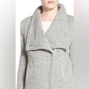 Chic gray cardigan with a textured knit. Ideal for layering and adding style.