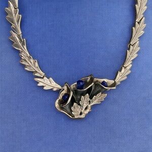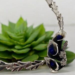 This stunning vintage sterling silver necklace from Taxco, Mexico, showcases exceptional craftsmanship and bold modernist design. The exquisite pendant features a trio of beautifully sculpted calla lilies. The petals curve gracefully around a vibrant, rich blue lapis lazuli gemstone, which serves as the focal point (pistil) of the central bloom. Delicate silver leaves unfurl elegantly from the base, adding a natural, intricate touch to this stunning, nature inspired piece.
