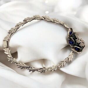 Expertly made and stamped “TM-17” in two different places, “Mexico” and “950,” this piece exemplifies the artistry of early 1980s Taxco silversmithing- where contemporary lines meet timeless Mexican tradition. The heavy, well-constructed leaf design chain lies beautifully along the neckline, creating an elegant and commanding statement look.