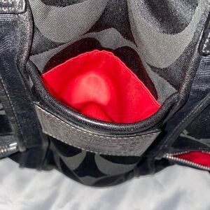 Elegant Coach shoulder bag in black. Features silver details and dual handles. Perfect for everyday style.