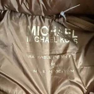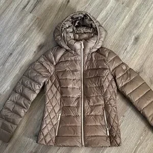 Chic Michael Kors quilted puffer jacket in a versatile tan/brown color. Lightweight yet warm with a flattering fitted shape and attached hood, perfect for everyday winter wear.