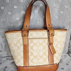 Coach 2001 RARE vintage mini Signature Light Brown Camel Beige Gold Raffia Tote
