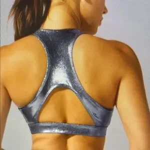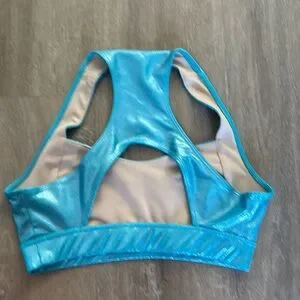 Shiny blue metallic sports bra. Racerback design. Comfortable and stylish.