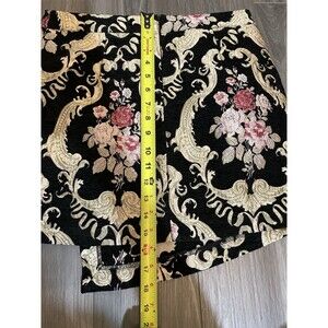 Chic mini skirt with floral embroidery. Features intricate pink and cream patterns on a black background. Perfect for a stylish look.