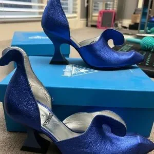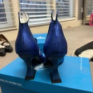 Striking metallic blue heels with unique design. Perfect for adding flair to any outfit.