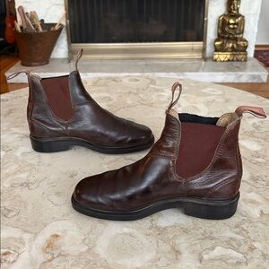 In good preowned condition classic Blundstone 500 leather Chelsea boots in chestnut brown. This classic 550 Blundstone walnut twin gore boot has been designed to include all-season leather, water resistant elastic, pull loops, full length comfort footbed, and a molded, reinforced heel. The Blundstone 550 Original walnut twin gore Chelsea is one of the most versatile Blundstone boots.