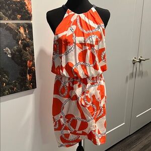 Vibrant Lilly Pulitzer Kennet dress in Booze Cruise has nautical rope pattern. This 100% silk dress has an elastic waist and a halter style neckline with navy blue rope adjustable gold chain. Perfect for sunny days.