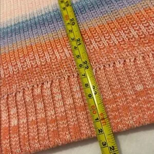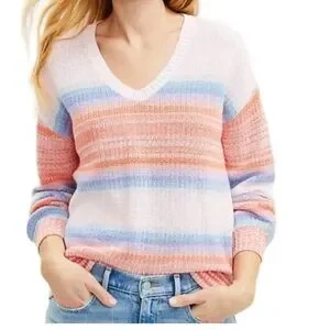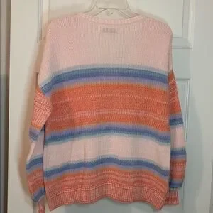 Chic V-neck sweater by LOFT. Features pink, orange, and blue stripes. Perfect for casual wear. This is used has some wear overall good shape