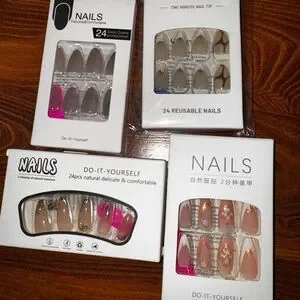 NWT. Selling all four sets together. Each nail set has 24 reusable nails. Each set comes with glue stickers and nail file. All are almond shape. Short to medium lengths. Pretty and minimalistic designs. Smoke and pet free home. Bought in Asia. One set was approx $25