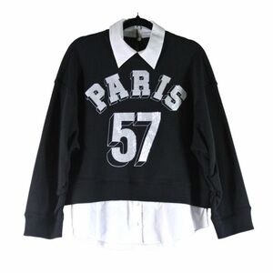 Chic black varsity top with bold Paris 57 graphic. Ideal for a stylish look.