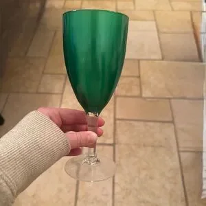 Stylish green wine glass with a clear stem. Perfect for any occasion. Set of 8. Gently used. Non smoking home. Sold as is. Made of an acrylic material, not glass.