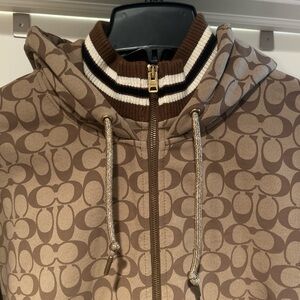 Tan zip-up hoodie with signature pattern. Features a hood and front pockets. Ideal for casual wear.