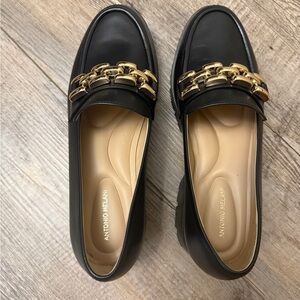 Elegant black all leather loafers with striking gold chain accents. Ideal for any occasion. size 8 1/2 New without tag.
