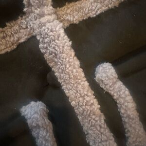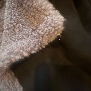 Chic black teddy jacket with cozy gray trim. Features large pockets and a stylish collar. Perfect for cool weather.