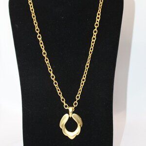Gold Flora pendant on a very long golden chain that can be worn at 18" length or doubled to be a shorter length. Both ways look elegant. With pendan, the length totals 21" and has a beautiful rolo chain. Signed Express on the back of the pendant. A couple of slight scratches that are not noticable.