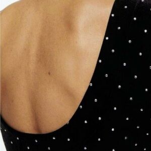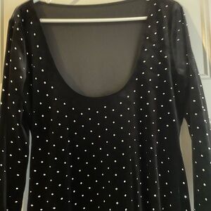 Perfect for the holidays! Velvet dress with silver “rhinestones”. Full coverage in front with a small dip in the back. Worn once. Full disclosure the labels were removed because they were itchy! Size large with stretch.